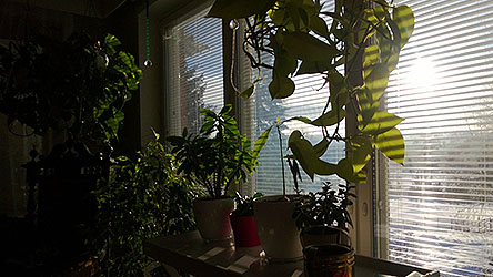Tuo sisäkuva on työhuoneeni ikkunasta. Työpöytäni on ikkunan oikealla puolella ja tulee napsittua usein kuvia kukkapöydästä, kun siihen käy valo niin nätisti.